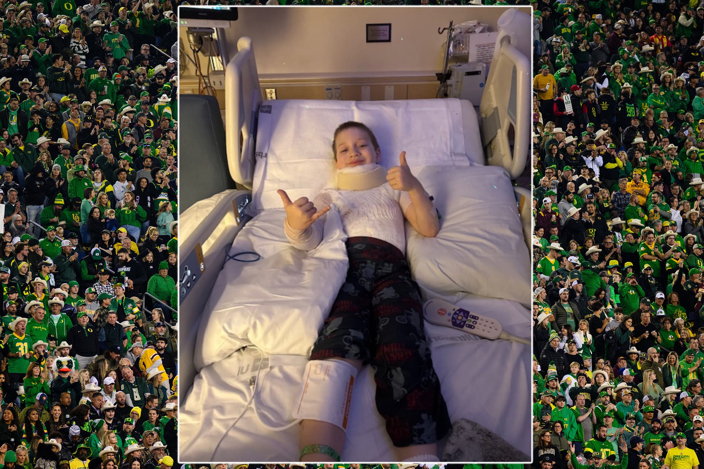 On Friday, he’ll watch his Ducks play Indiana in a semifinal of the College Football Playoff from his bed in the pediatric unit of the Legacy Oregon Burn Center.