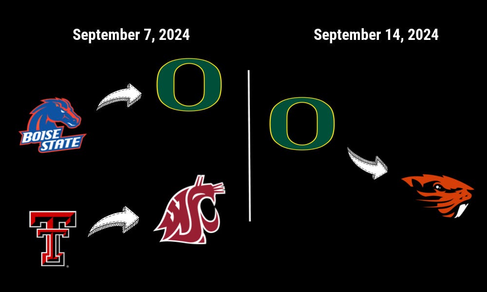 Boise State also helped. It was UO’s originally scheduled opponent for Sept. 14. The Broncos State will instead play in Eugene one week earlier (Sept. 7).