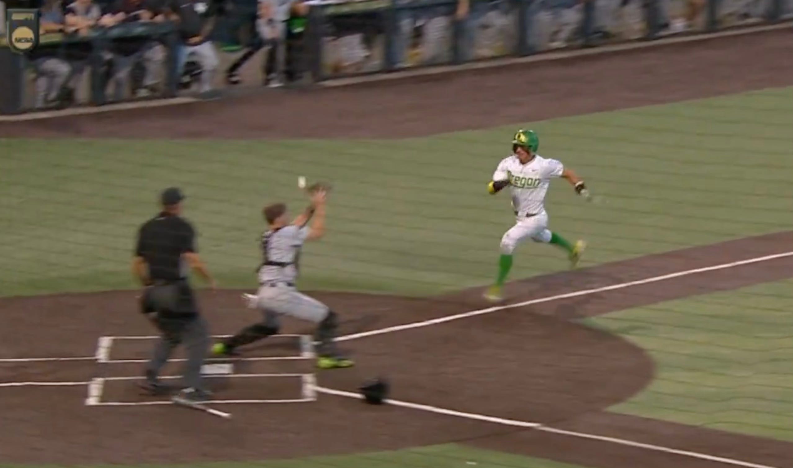 Let’s start at the Eugene Regional. After a seven-minute instant-replay review, Aroz was called out at home plate. The umpires deemed it “malicious contact.” He’ll sit out Saturday’s game. I’d love for readers to unpack the play for themselves. But I’m struggling to understand what Aroz or any reasonable baserunner should have done.