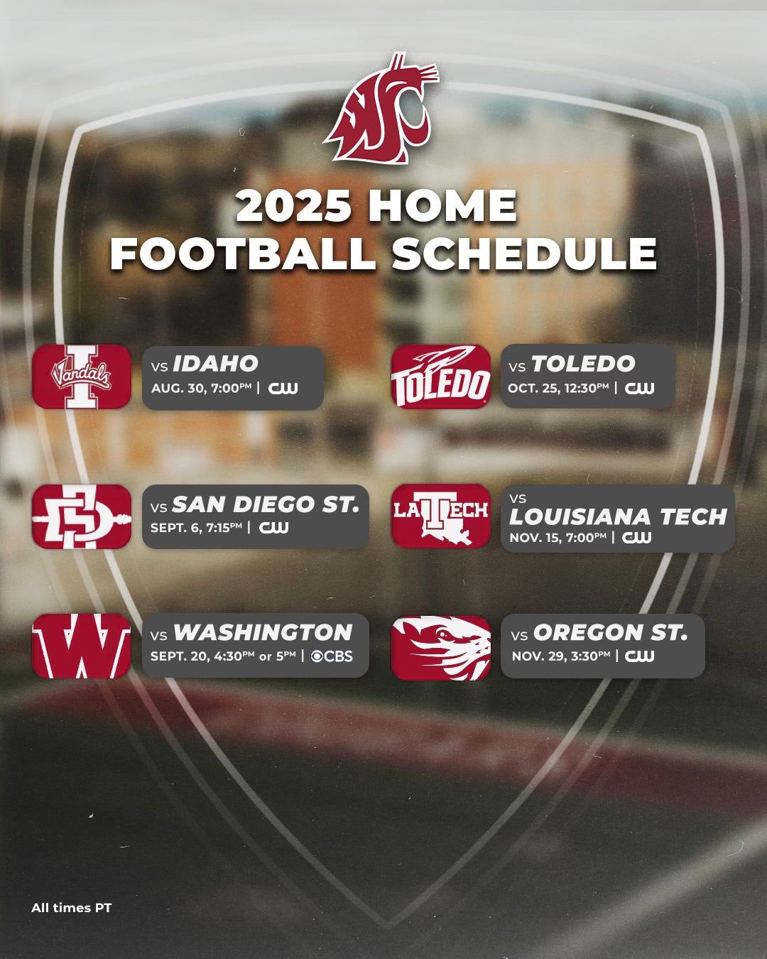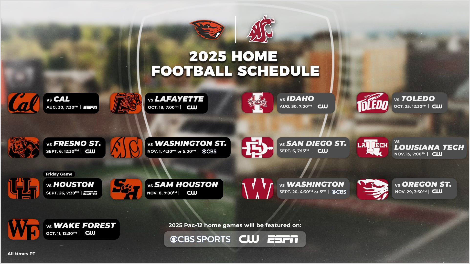• Washington State plays twice on CBS (one home, one away), and the Cougars have five home games on The CW in 2025. WSU is now led by first-year coach Jimmy Rogers.
