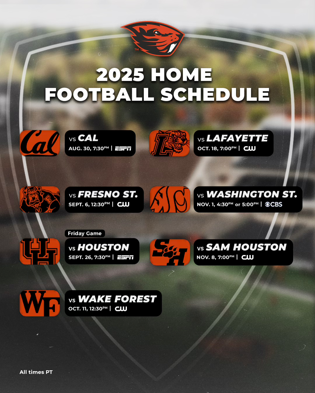 • The 2025 TV deal couldn’t have worked out much better for the Beavers. OSU gets two home games on ESPN, one on CBS, and has five other games on The CW (four home, one away). It’s solid exposure for a team capable of winning games behind transfer QB Maalik Murphy.