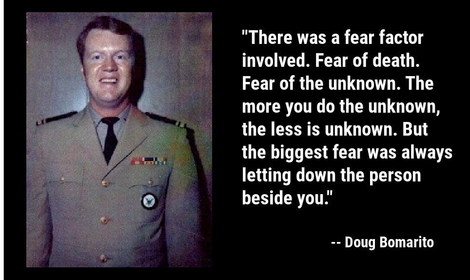 “There was a fear factor involved,” Bomarito told me. “Fear of death. Fear of the unknown. The more you do the unknown, the less is unknown. But the biggest fear was always letting down the person beside you.”