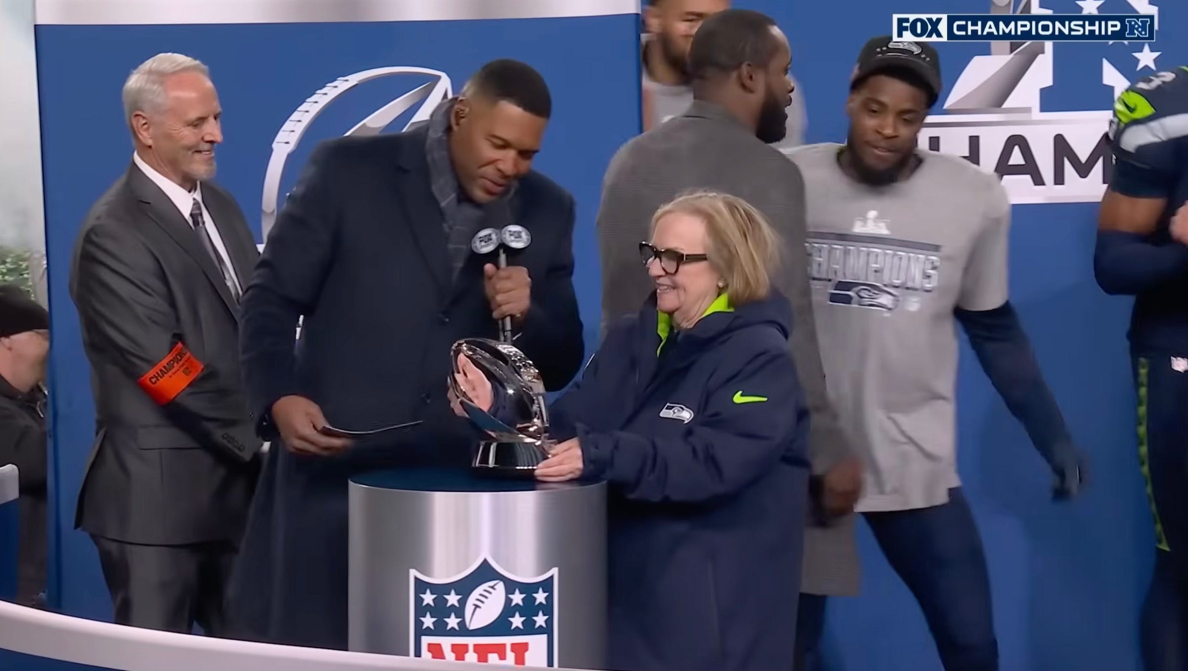 Same Jody, a few hours later, was being handed the George Halas Trophy on the FOX television broadcast. She stood on stage, giddy and bubbly, and cradled the thing like a supermarket cantaloupe after the Seahawks beat the Rams, 31-27.