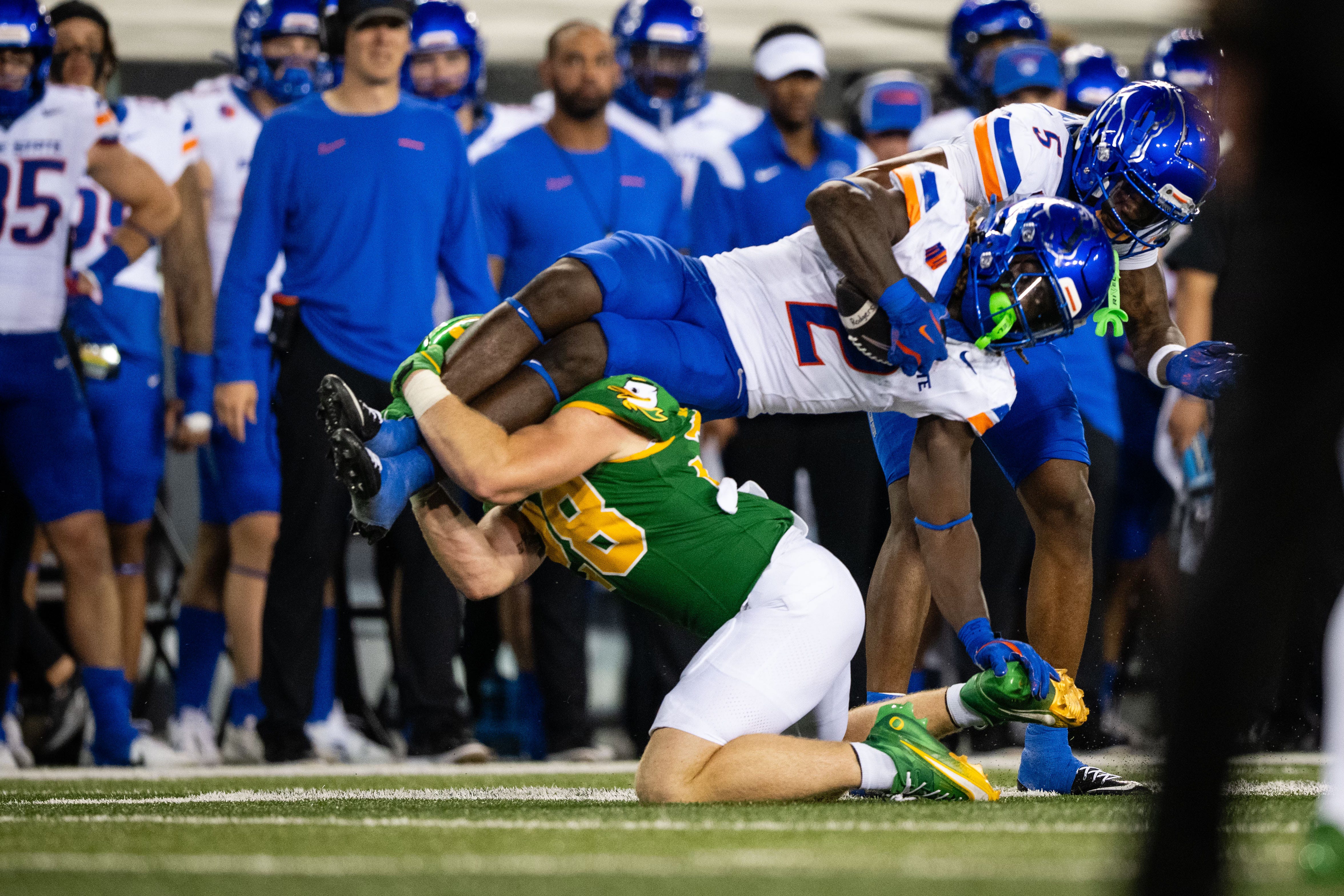 • Boise State’s Ashton Jeanty is a terrific running back and emerging Heisman candidate. He gained 126 yards on 11 carries against Portland State. He ran for 192 yards on 25 carries against Oregon. Said Barnum: “He doesn’t need a window or his lane. You just have to give him a little bit of light, and he’s through it.”