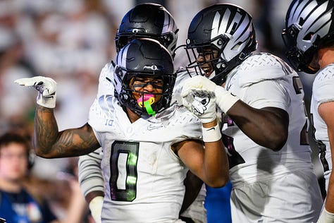ESecPN got all dressed in white for the Gameday show to predict a Penn State Win, and then buried the Ducks' win on their website. Few thought the Ducks would win, Yet by the stats, the Ducks outplayed Penn State in every category, even though the final score didn't suggest that. What is all the more amazing is the maturity of this young team- seemingly unfazed by the supposed "one-score advantage" of the White Out. That's all we heard about from the prognosticators. The Ducks weren't listening. Freshmen played like seasoned veterans, not first year players. And any questions about Dante Moore and Oregon's O and D lines got answered by "wow." This team is for real. Enjoy your bye-week, Ducks. You earned it!!
