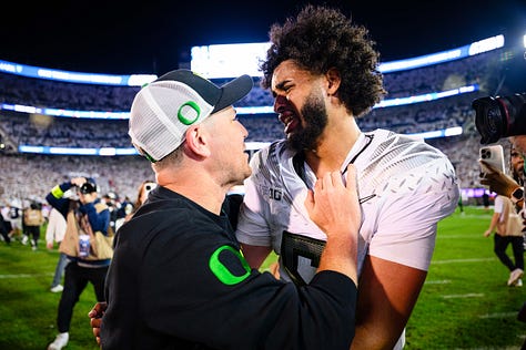 I watched the Oregon Ducks paint a competitive masterpiece in a resilient, 30-24, double-overtime victory. It was a classic. And Dan Lanning’s glassy eyes stole the show for me.