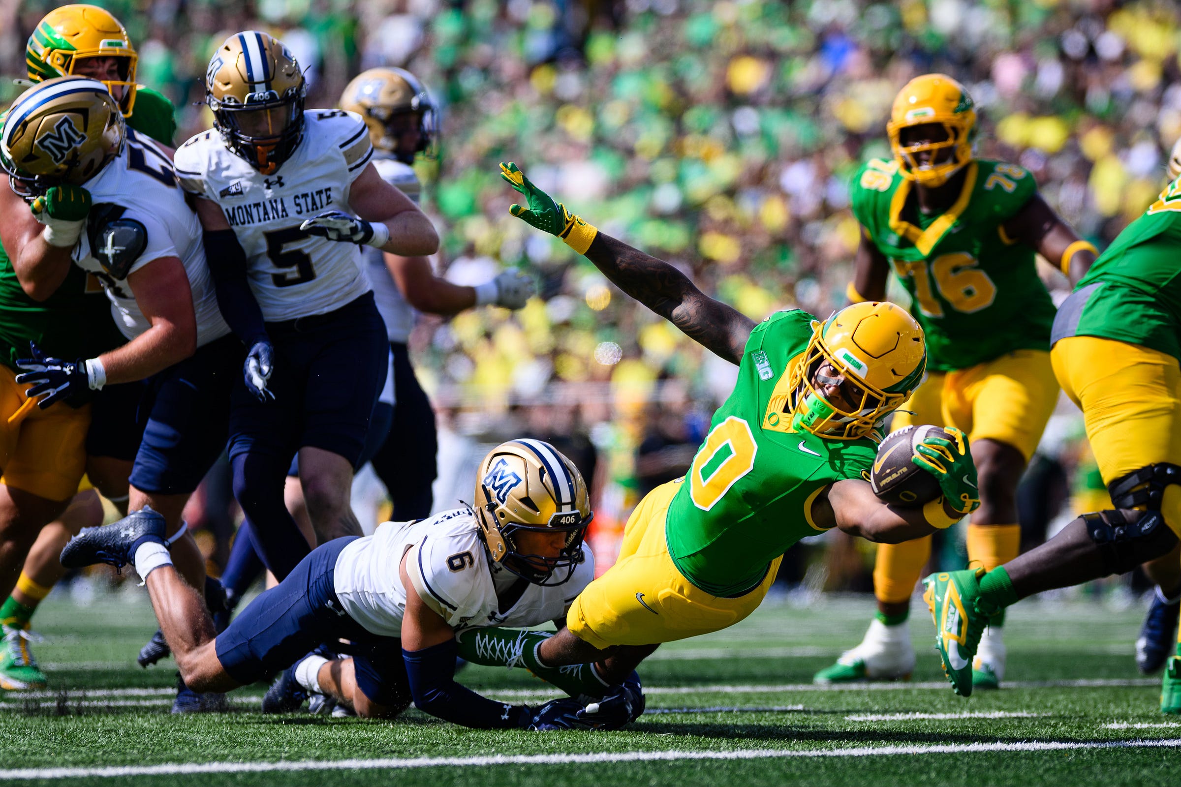 EUGENE — Fans looked delighted. Coaches sounded happy. Dante Moore threw three touchdown passes, and the Oregon Ducks throttled Montana State 59-13 on Saturday in the season opener at Autzen Stadium.