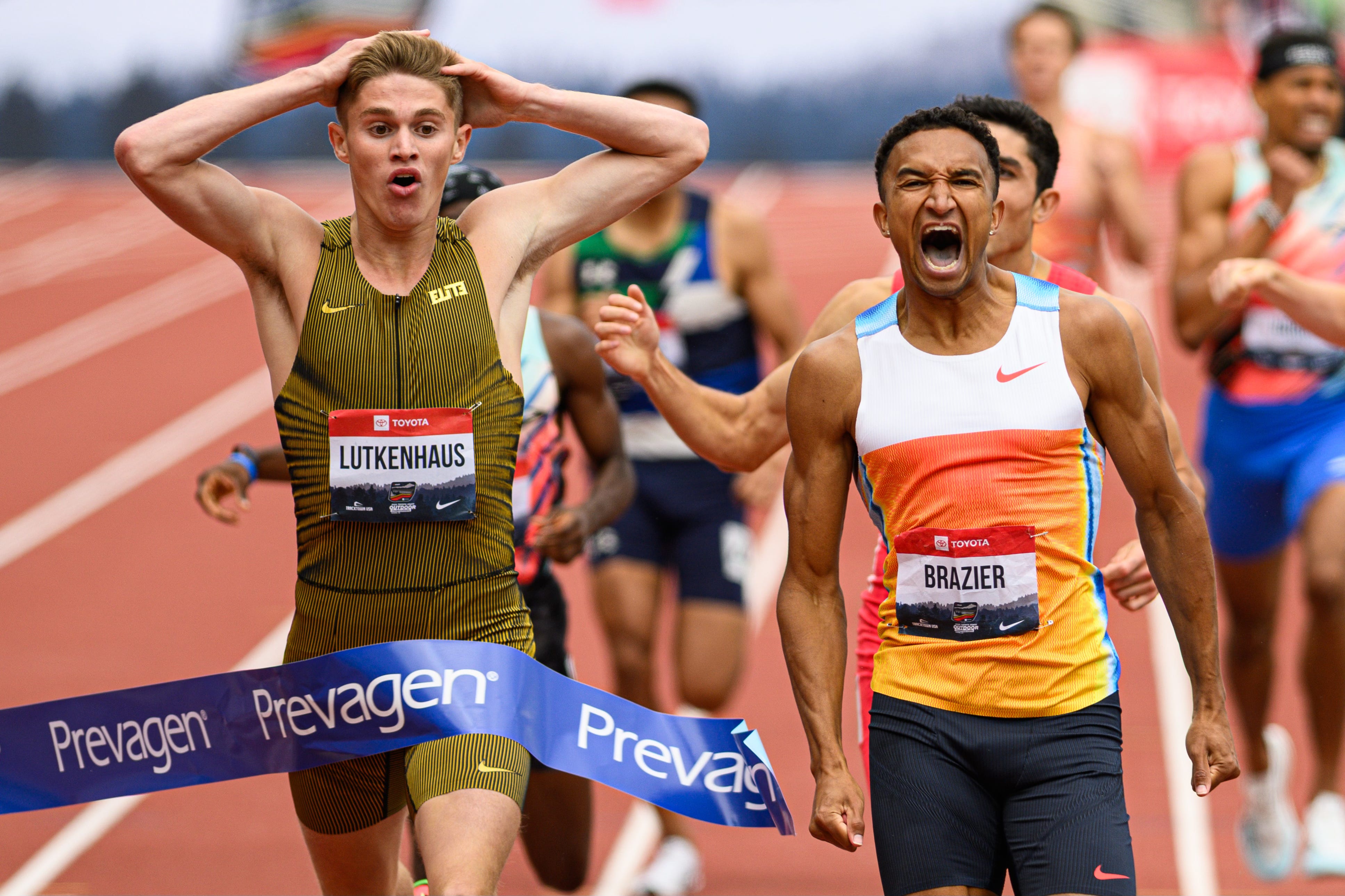 Donavan Brazier wins the 800-meter National championship over 16-year-old Cooper Lutkenhaus in Eugene. It was the first time Brazier competed after a 1,110-day injury layoff. He won and celebrated a remarkable comeback after multiple surgeries.