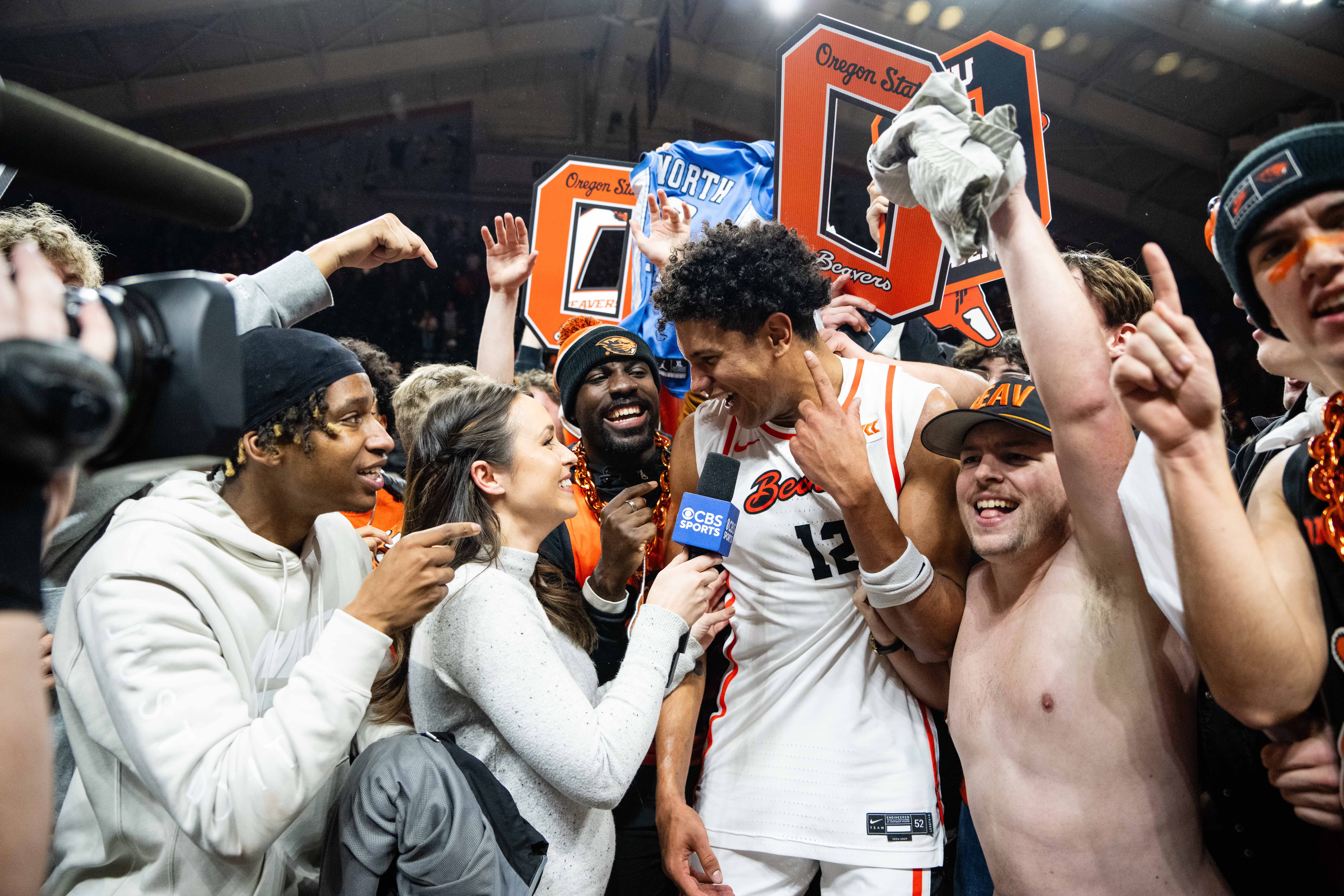 Naji Saker captured the post-game euphoria as Oregon State upset No. 16-ranked Gonzaga at Gill Coliseum last January. Michael Rataj led the Beavers with a career-high 29 points, including 10 in the extra period. Fans spilled onto the court to celebrate, and the CBS reporter interviewed Rataj, while Saker snapped this photo.