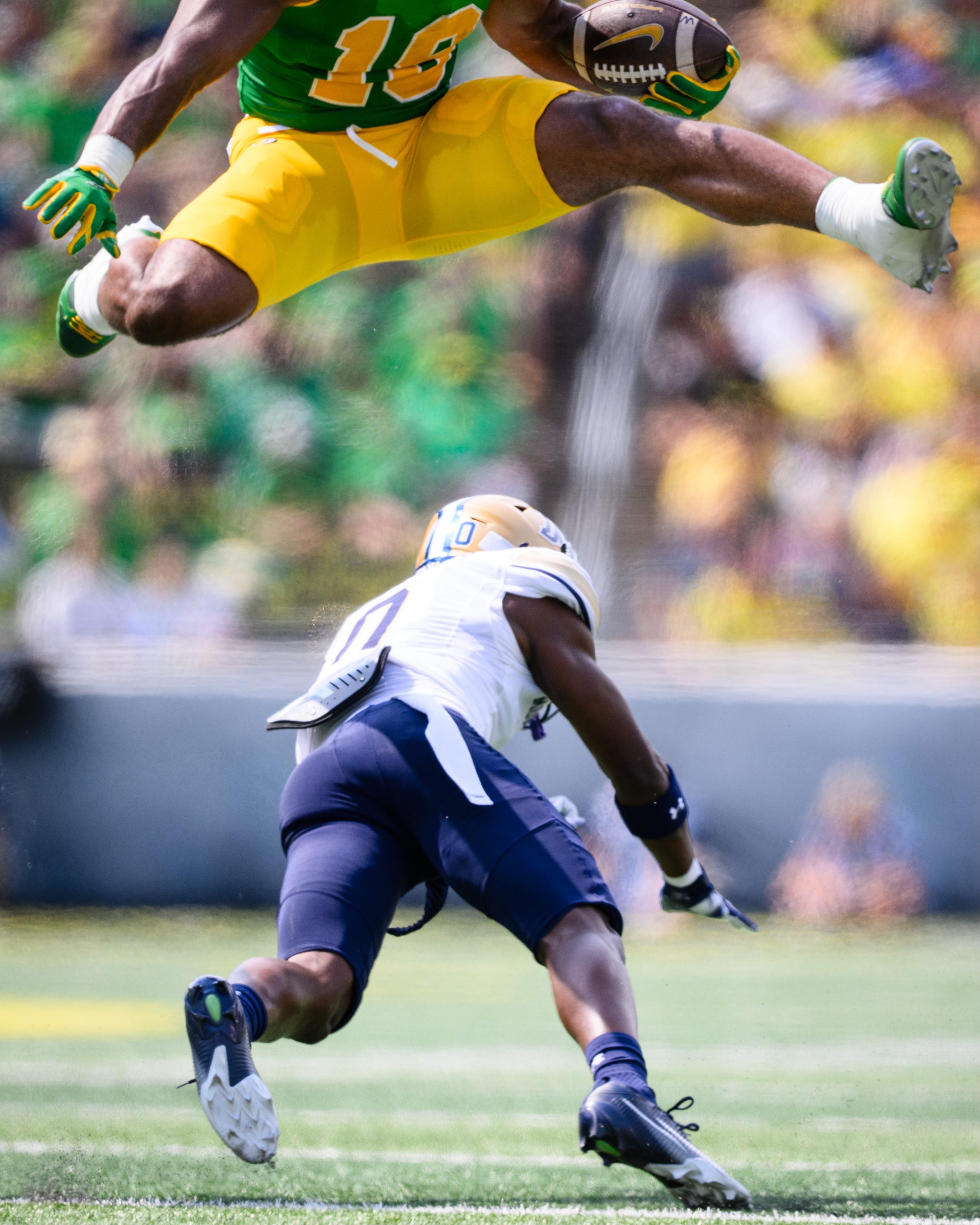 Naji Saker’s photograph of Oregon tight end Kenyon Sadiq says so much, doesn’t it? Sadiq is a terrific run blocker, a big vertical threat in the passing game, and an absurd all-around athlete. He’s projected as a no-brainer high NFL Draft pick. He caught a pass in Oregon’s season-opening victory and jumped over a helpless Montana State defender. He didn’t just fool the would-be tackler; he duped the photographer by leaving the photo frame.