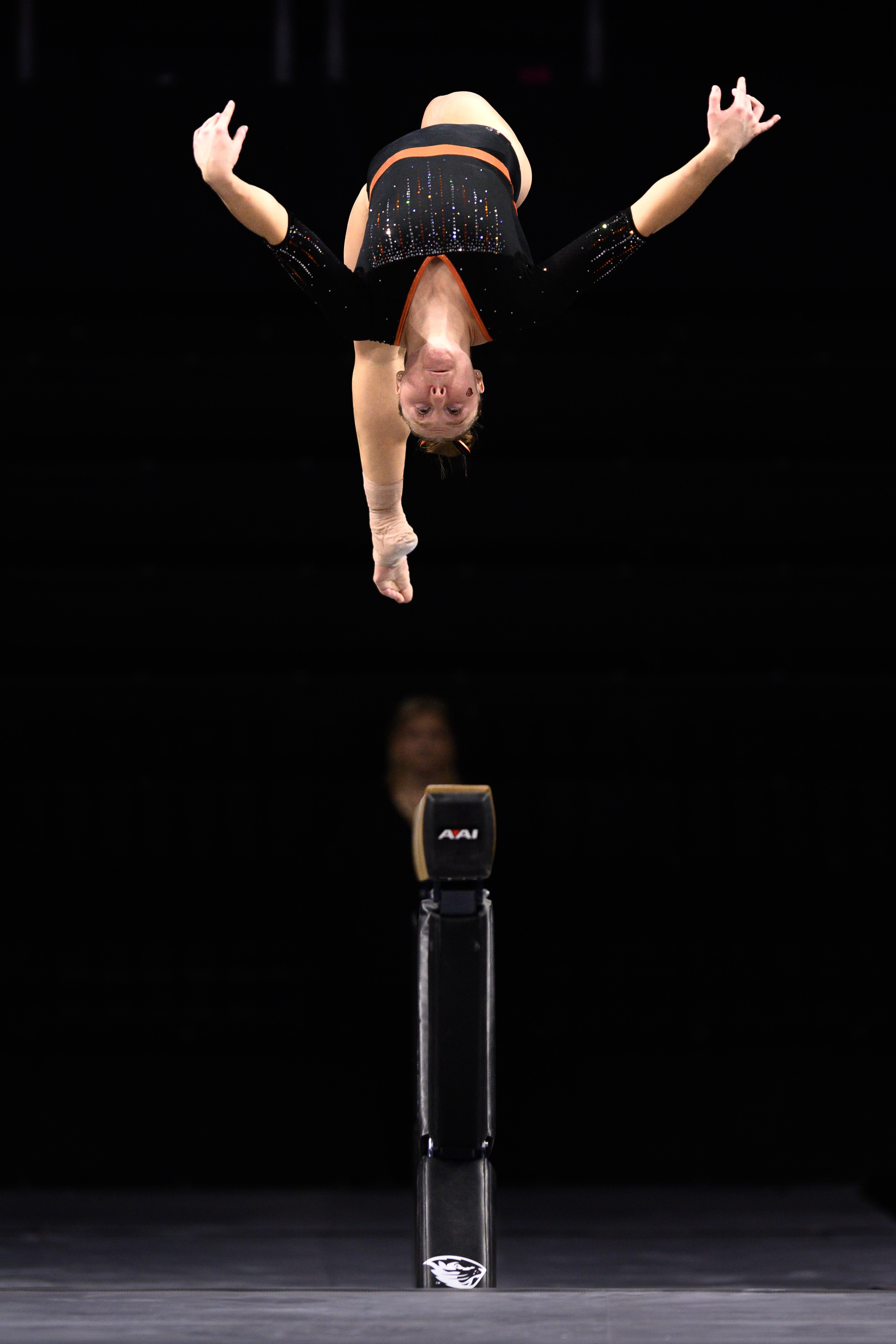 Tim Healy captured this shot of Olivia Buckner on the beam for Oregon State gymnastics using his Nikon Z-9 camera. The photo composition — and the dismount — are both incredible.