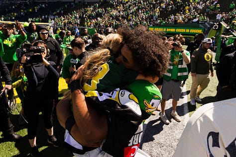 One of the highlights came when the stadium’s public address announcer, Don Essig, alerted the crowd that two former UO players had been picked in the sixth round of the NFL Draft.