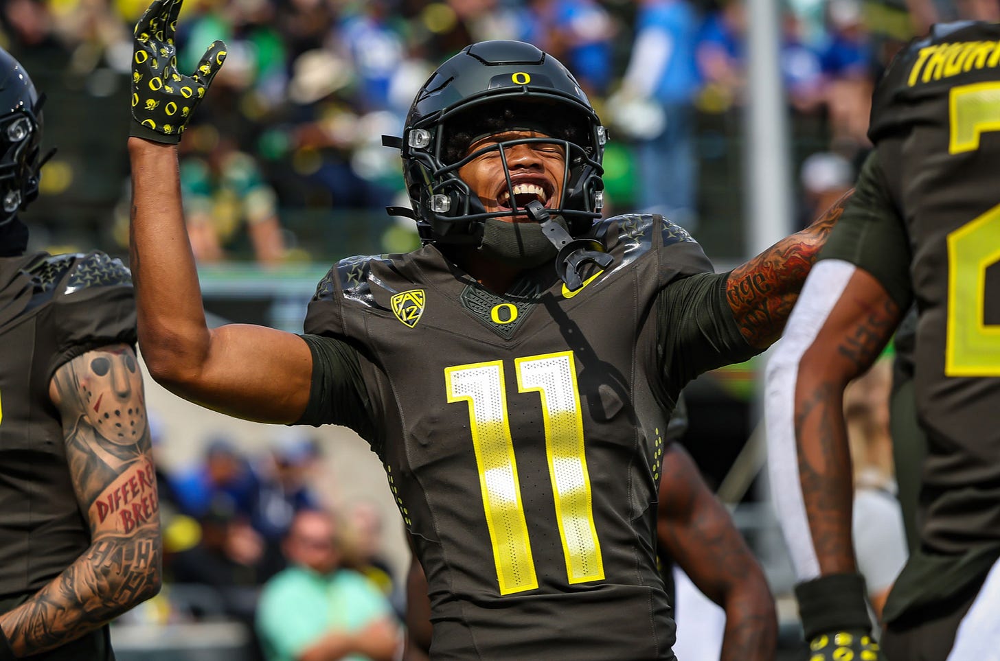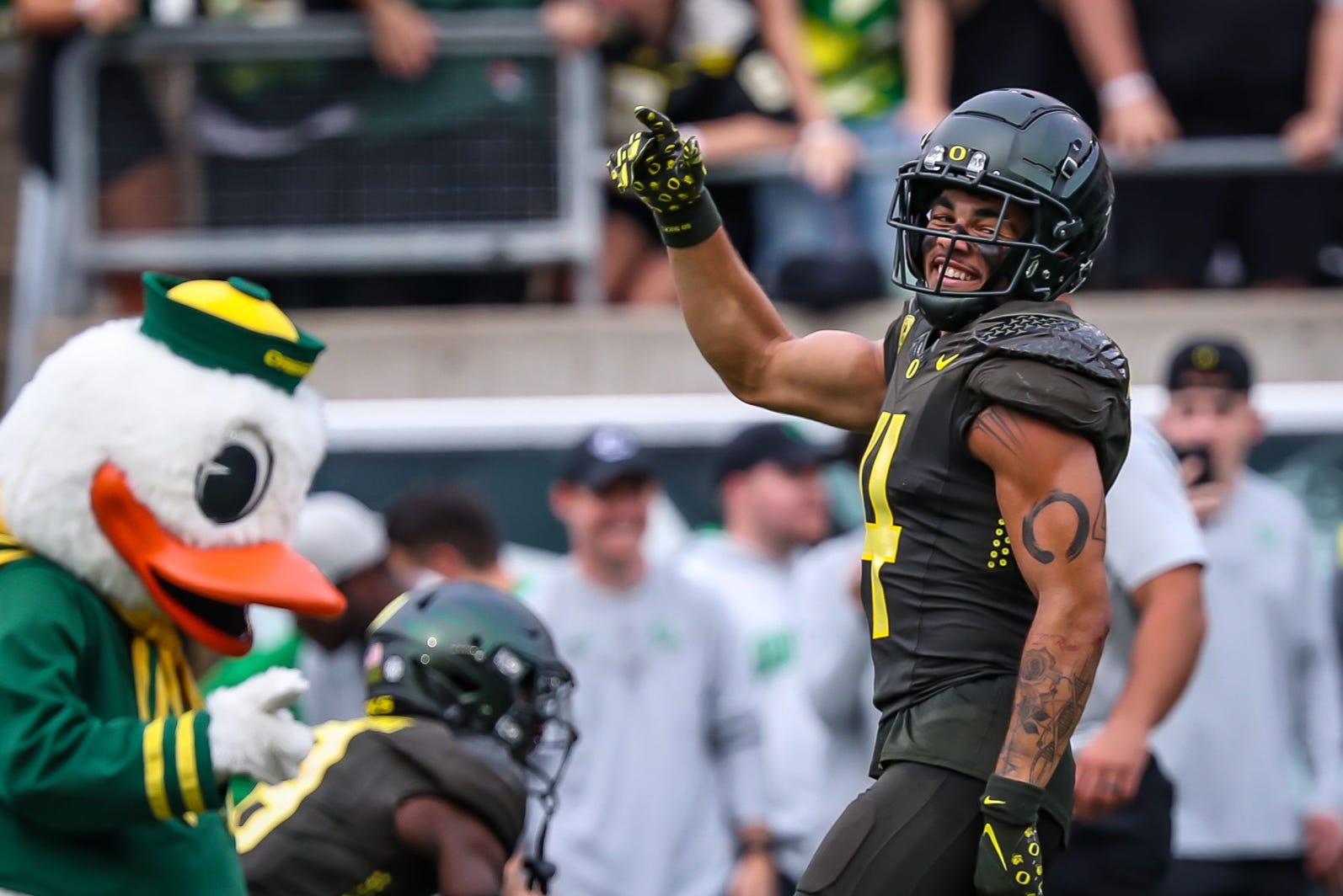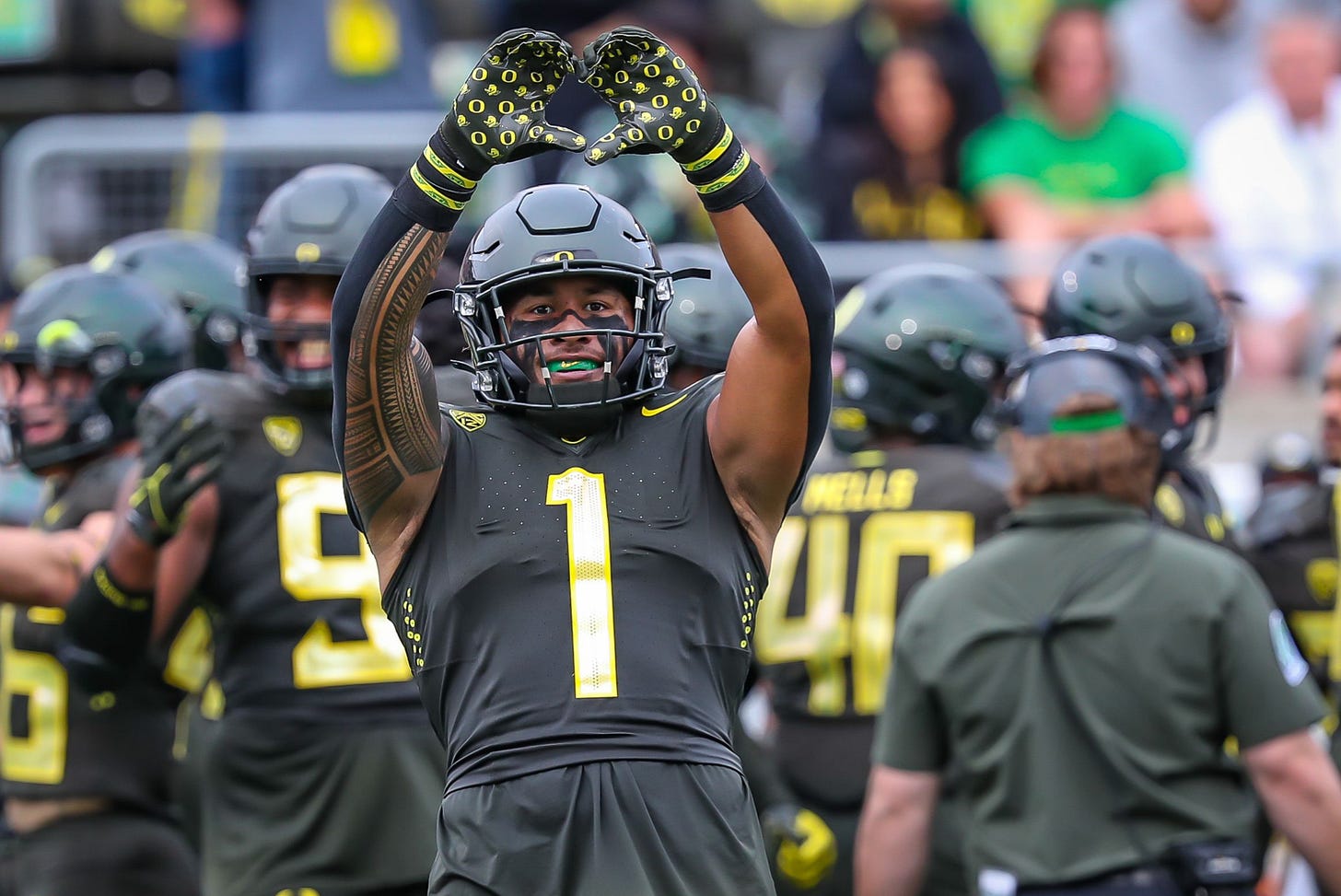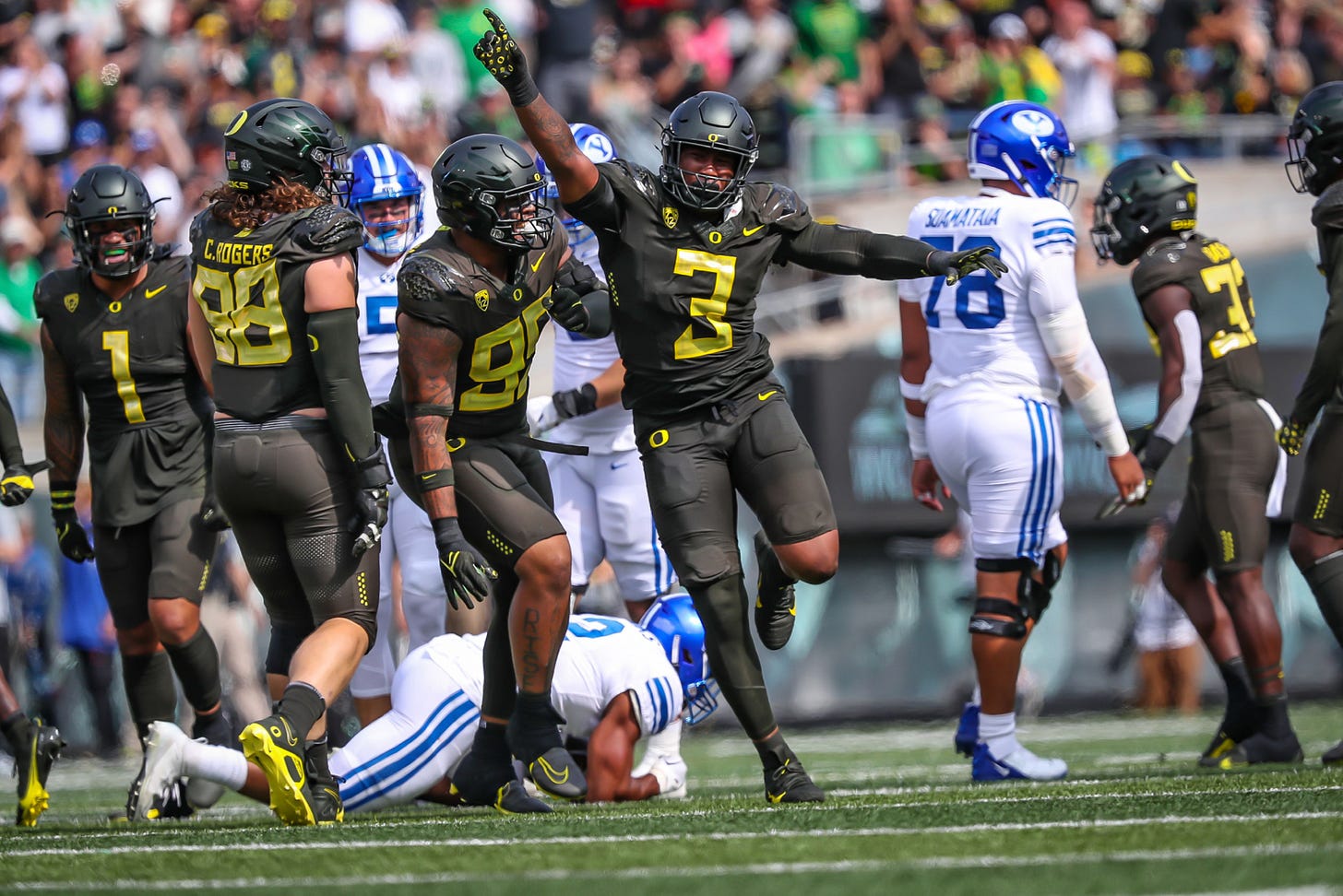 Oregon’s Brandon Dorlus celebrates after a big play. (Serena Morones)