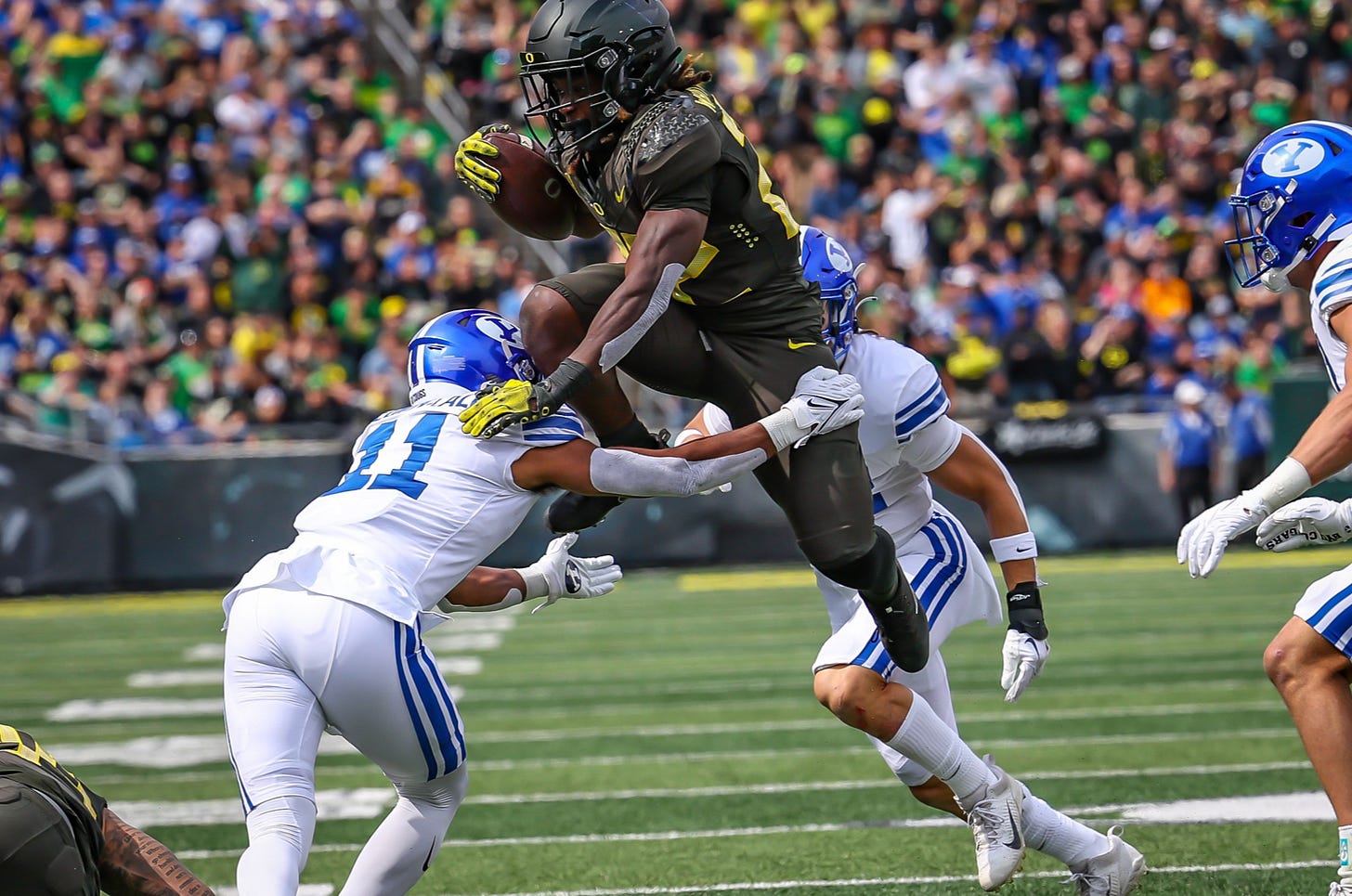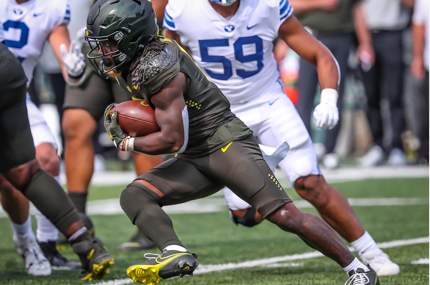 Oregon RB Bucky Irving runs with the ball against BYU. (Photo: Serena Morones)