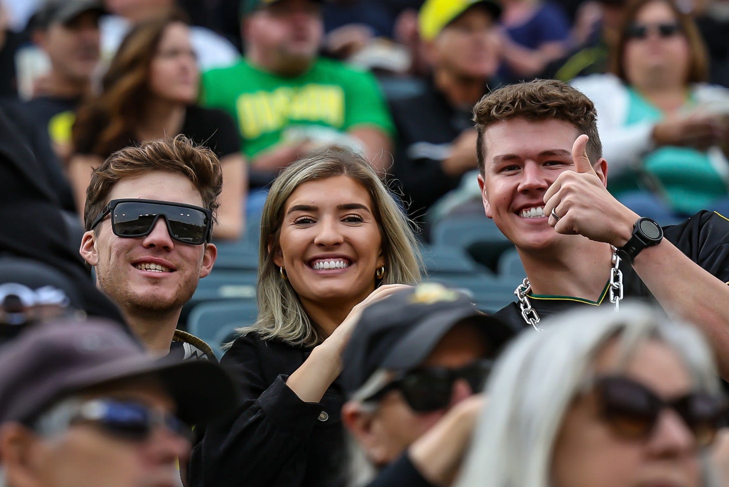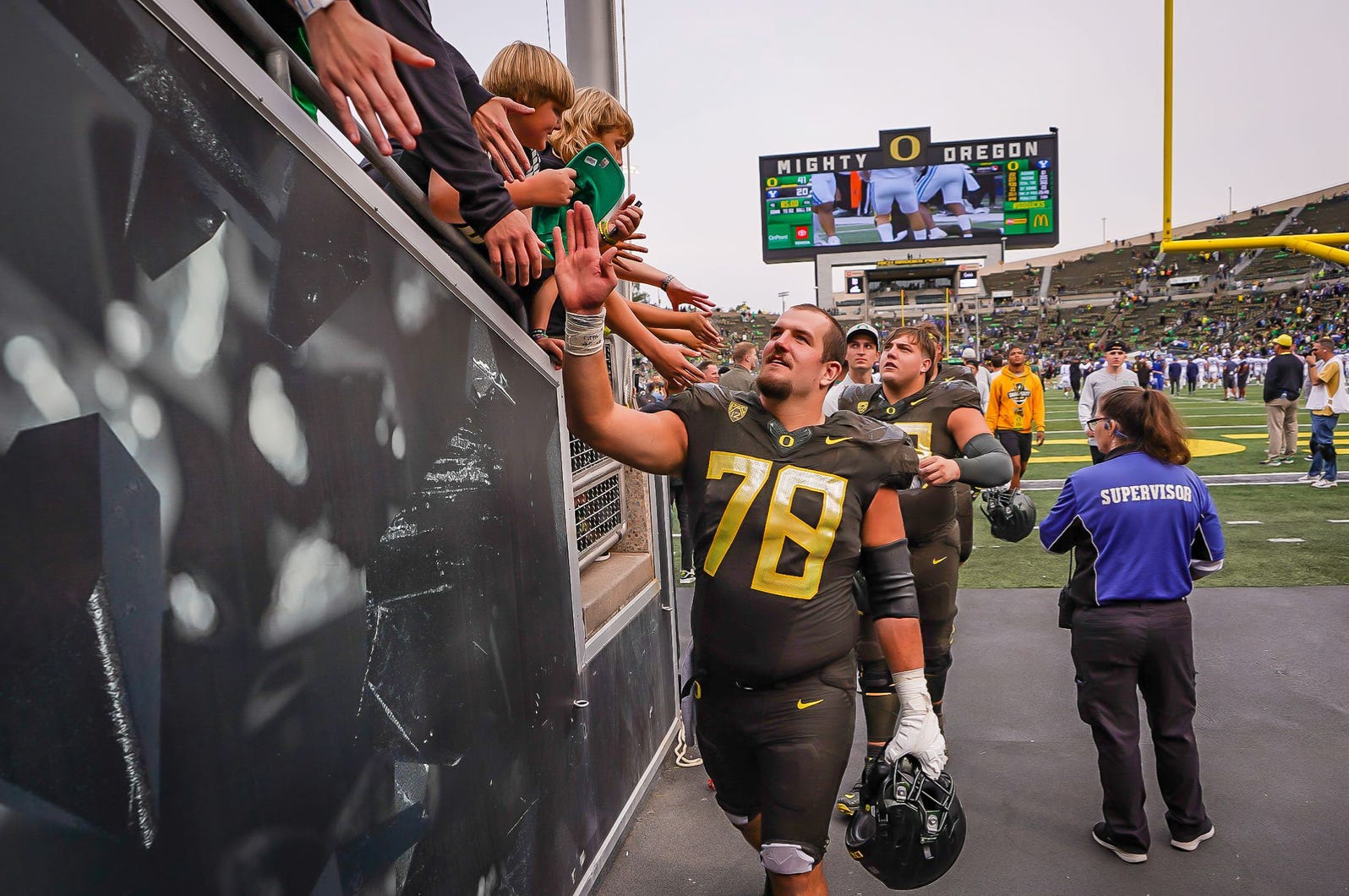 Oregon’s Alex Forsyth celebrates with fans. (Photo: Serena Morones)