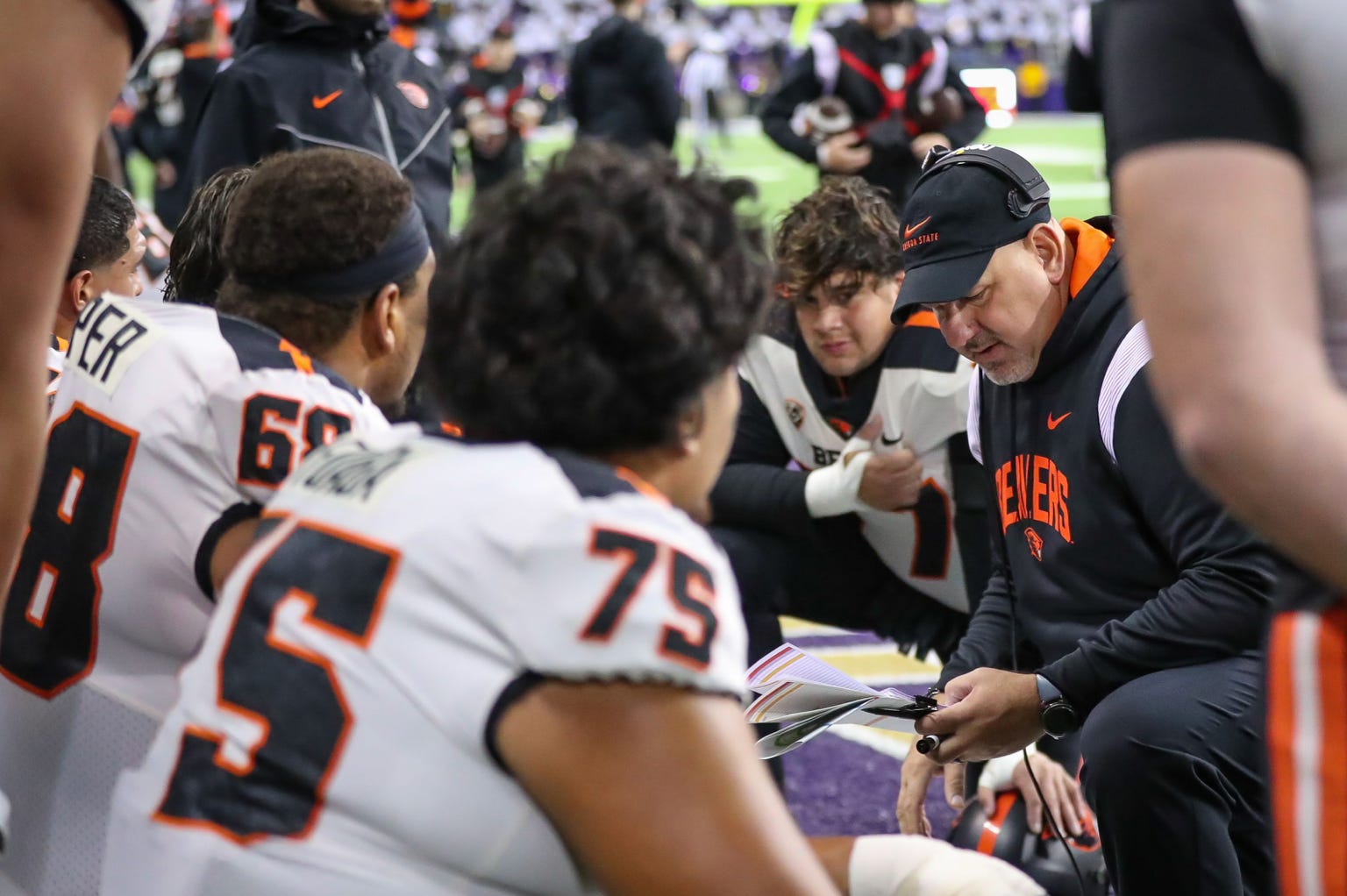 Oregon State’s offensive line coach Jim Michalczik talks with players. (Photo: Serena Morones)